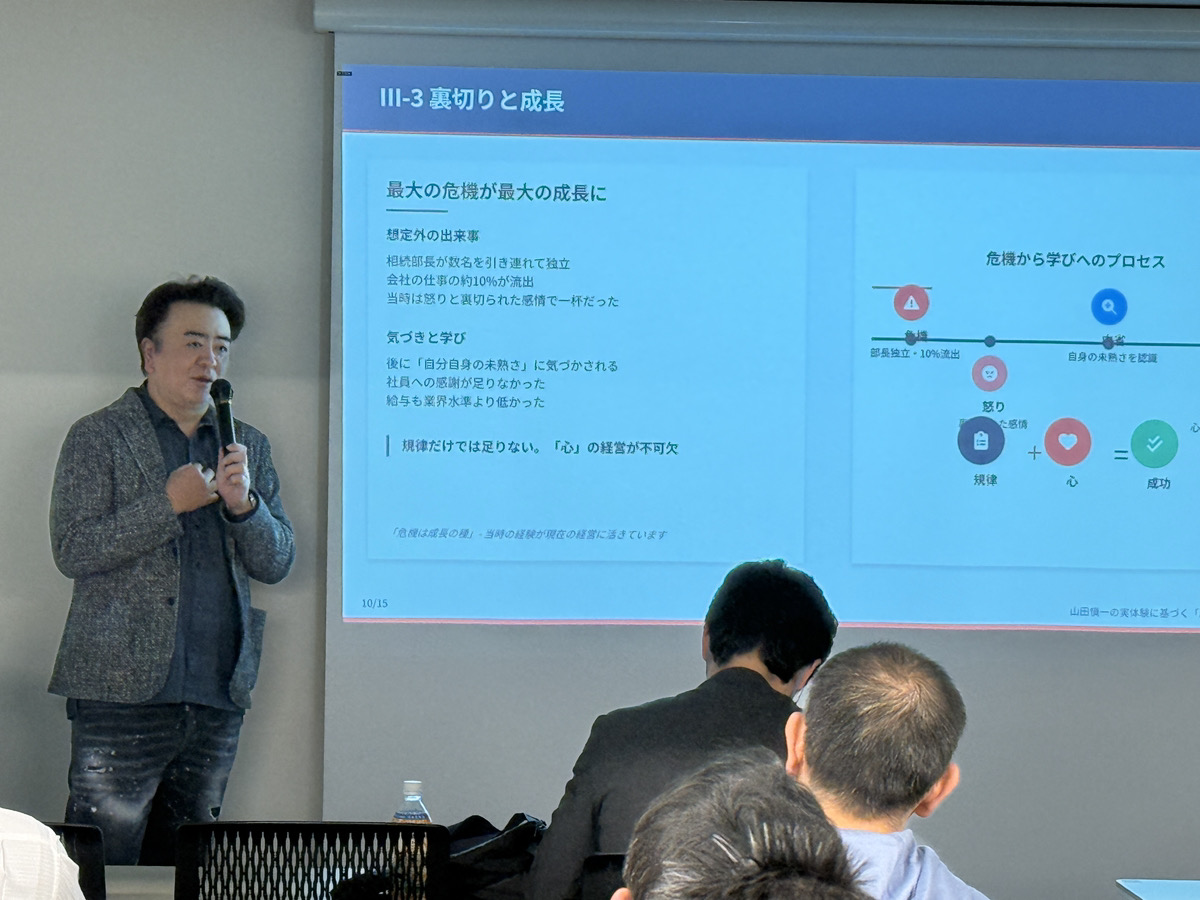 今回は、グリーン司法書士法人 代表 山田先生を講師にお招きし、多拠点展開と急成長の秘訣をテーマとした研修会を開催いたしました。 研修では、山田先生が乗り越えて来られた数々の苦難や、同法人の成長戦略について詳しくお話しいただきました。特に、長期的な思考で先行投資を続ける姿勢や逃げられない状況の作り方など、法人経営の多大なヒントを共有いただきました。